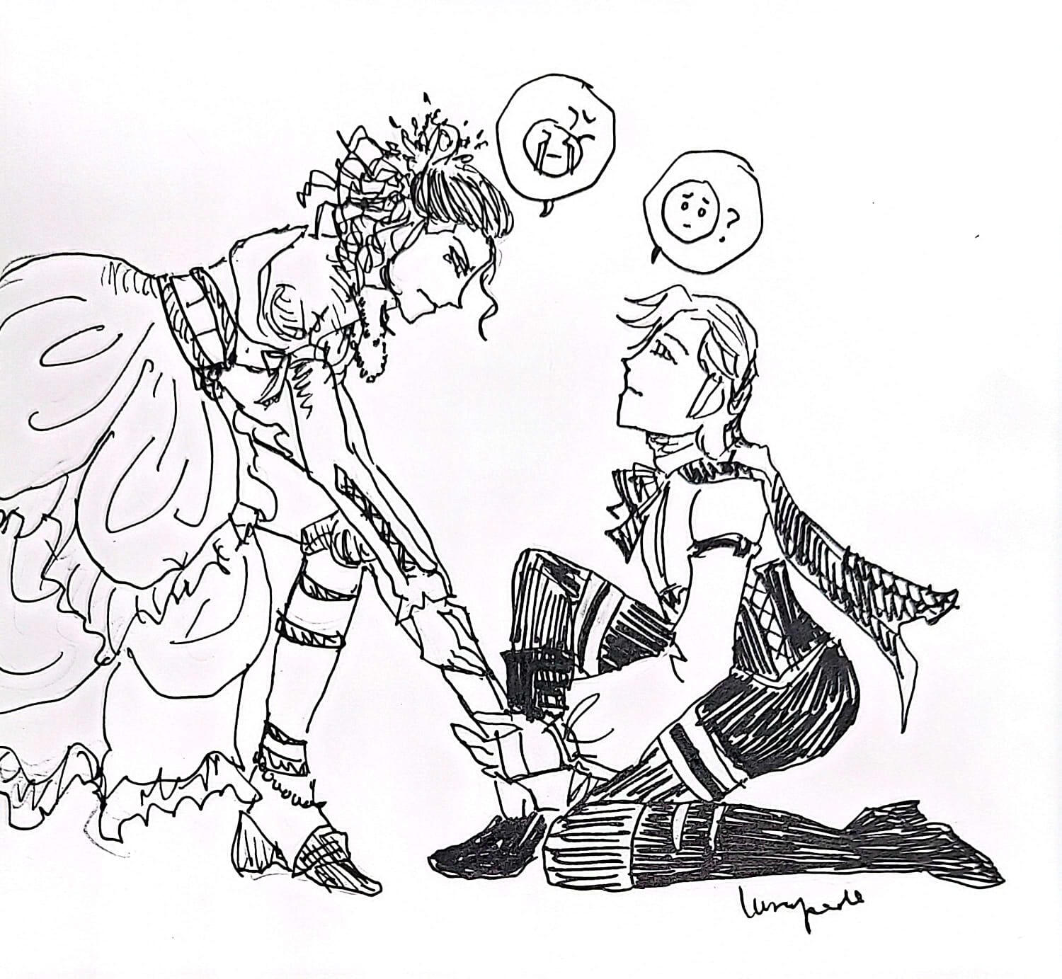 Nowadays, Sky is Sol's little brother figure, whom she loves to tease. However, their relationship wasn't always like that, in fact, it was all the contrary.When Sol selected Sky as her assistant, she expected to have someone like her. Loud and proud, strong and hot, passionate, someone worthy of appearing in Baywatch. However, she was met with someone who was…quite the opposite. Sky was a quiet kid, serious, and worst of all: afraid of deep waters. This wasn't the kind of assistant Sol wanted, but he was already bound to her, and even when she tried to beg Sun and Moon (her bosses) to let her change assistants, they denied it, which made her hate the redhead a little bit more.To her, Sky represented a burden, and was often subject of her mistreatments, as she overworked him, bullied him, triggered his traumas with water and ultimately “fired” him, telling him that she didn't want to see him around her pool and her home ever again.What she didn't know, though, was that Sky had become the pillar to her messy lifestyle. His disposition for organization and quiet hard work at the pool had spared Sol from the duties she hated to do, as well as taking care of her own house chores. Sky, truly, was the fairy that granted Sol some stability in her life. The only person who never complained about her, and was sworn to do whatever she asked of him.With Sky gone, Sol quickly sank into realization, but her ego didn't let her admit she needed the redhead back. It was until she couldn't bear the weight of her own actions, when she broke down and seeked Sky again, apologizing to him for giving him a hard time and promising to become a better boss, friend, and older sister.